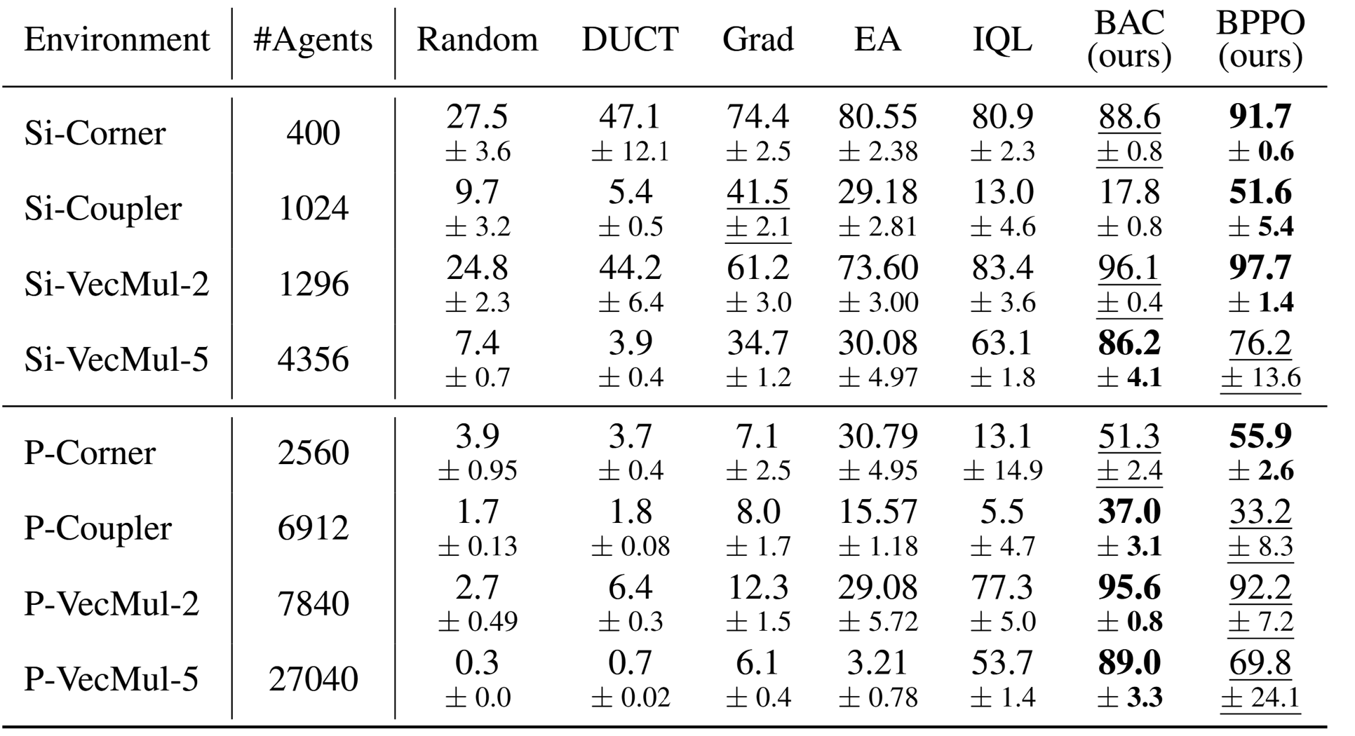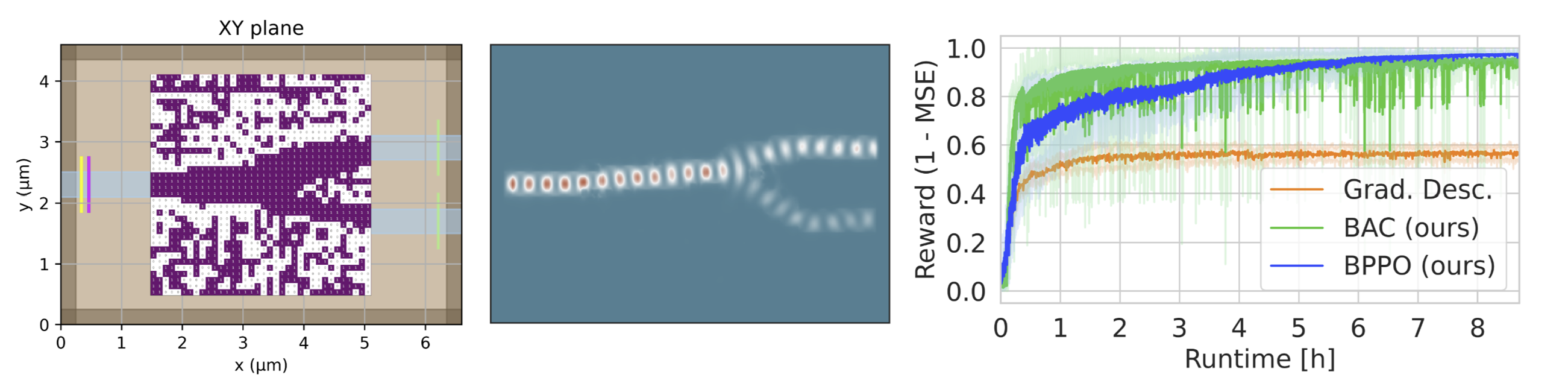 We test the feasibility of MARL in several topology optimization tasks for optical computing. Our Bandit variants of PPO (BPPO) and the Actor-Critic approach (BAC) consistently outperform all baselines by a large margin. Most importantly, gradient based optimization (Grad) is the standard procedure in topology optimization, but is very prone to get stuck in local minima. Additionally, gradient-based optimization struggles with three-dimensional topology optimization, because the non-differentiable design constraints impede the optimization process. In contrast, MARL can easily incorporate these design constraints directly in the optimization process.